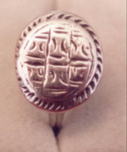 Silver Reproduction of a Theater Actor's Ring 2nd century AD. Ring is made of 925 silver from a mold of the original item. Put this ring on and entertain Roman Style. Price: 50.00 US |