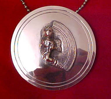a Two Pronged Bale. Mounted on the Pendant Disc is a Cupid. Reproduction